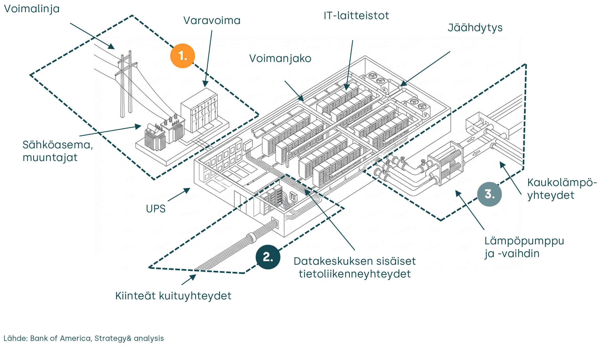 Datakeskukset EtusivuPalvelutPowerDatakeskuksetMonipuoliset ja laadukkaat energia- ja tietoliikenneratkaisut datakeskuksilleMeillä on vuosikymmenten kokemus kriittisten sähkö- ja tietoliikenneverkkojen suunnittelusta, rakentamisesta ja operoimisesta. Olemme kantaverkko- ja jakeluverkkoyhtiöiden, teleoperaattoreiden ja uusiutuvan energian tuottajien luotettu kumppani. Vahvan verkko-osaamisemme ansiosta ymmärrämme myös datakeskustoimijoiden tarpeet ja palvelemme heitä luotettavasti niin suunnittelu-, toteutus- kuin käyttövaiheessa. Tarjoamme voimajohdot, sähköasemat, energiavarastot ja tietoliikenneratkaisut luotettavasti kaikkiin datakeskusprojekteihin. Toteutamme myös kaikki uusiutuvan energian ratkaisut. Toimimme kumppanina myös lämmön talteenoton ratkaisuissa, vastaamme lämmön talteenoton ympärivuorokautisesta valvonnasta ja syötämme lämmön kaukolämpöverkkoon tehokkaasti ja turvallisesti. Asiakkaamme valitsevat meidät, koska tarjoamme alan korkeinta laatua, joustavuutta ja parhaat teknistaloudelliset ratkaisut. Datakeskusten kumppanina toimivien yksiköidemme NPS on +60. Palvelumme kattavat kaikki datakeskuksiin liittyvät verkot, sähköasemat ja lämmön talteenoton ratkaisut Suunnittelu Hankinnat ja laadunvarmistus Projektinjohto ja lupaprosessit Rakentaminen ja käyttöönotto Verkkojen kunnossapito ja modernisointi Ylläpito ja viankorjaus Suunnitteletko datakeskushanketta Suomeen tai Baltiaan, vietkö hanketta jo eteenpäin tai etsitkö kumppania datakeskuksen ulkoisen sähkö- ja tietoliikenneinfrastruktuurin suunnitteluun, rakentamiseen tai kunnossapitoon? Ota yhteyttä, niin keskustellaan, miten voimme olla avuksi hankkeesi eri vaiheissa. Ota yhteyttä! Rakennamme sähkö- ja kuituyhteydet uuteen suurdatakeskukseen Salaspilsissa Riikan lähellä. Hanke sisältää noin 3,5 kilometrin keskijänniteverkon sekä noin 2 kilometrin kuituyhteyden rakentamisen datakeskukselle. Vastaamme lämmön talteenoton ympärivuorokautisesta operatiivisesta valvonnasta asiakkaan datakeskuksessa Etelä-Suomessa. Lämmön talteenotto on tärkeä osa energiatehokasta datakeskustoimintaa. Ota yhteyttä! Ville MiettinenHead of Service Offering & Development+358 40 5361890ville.miettinen@enersense.com