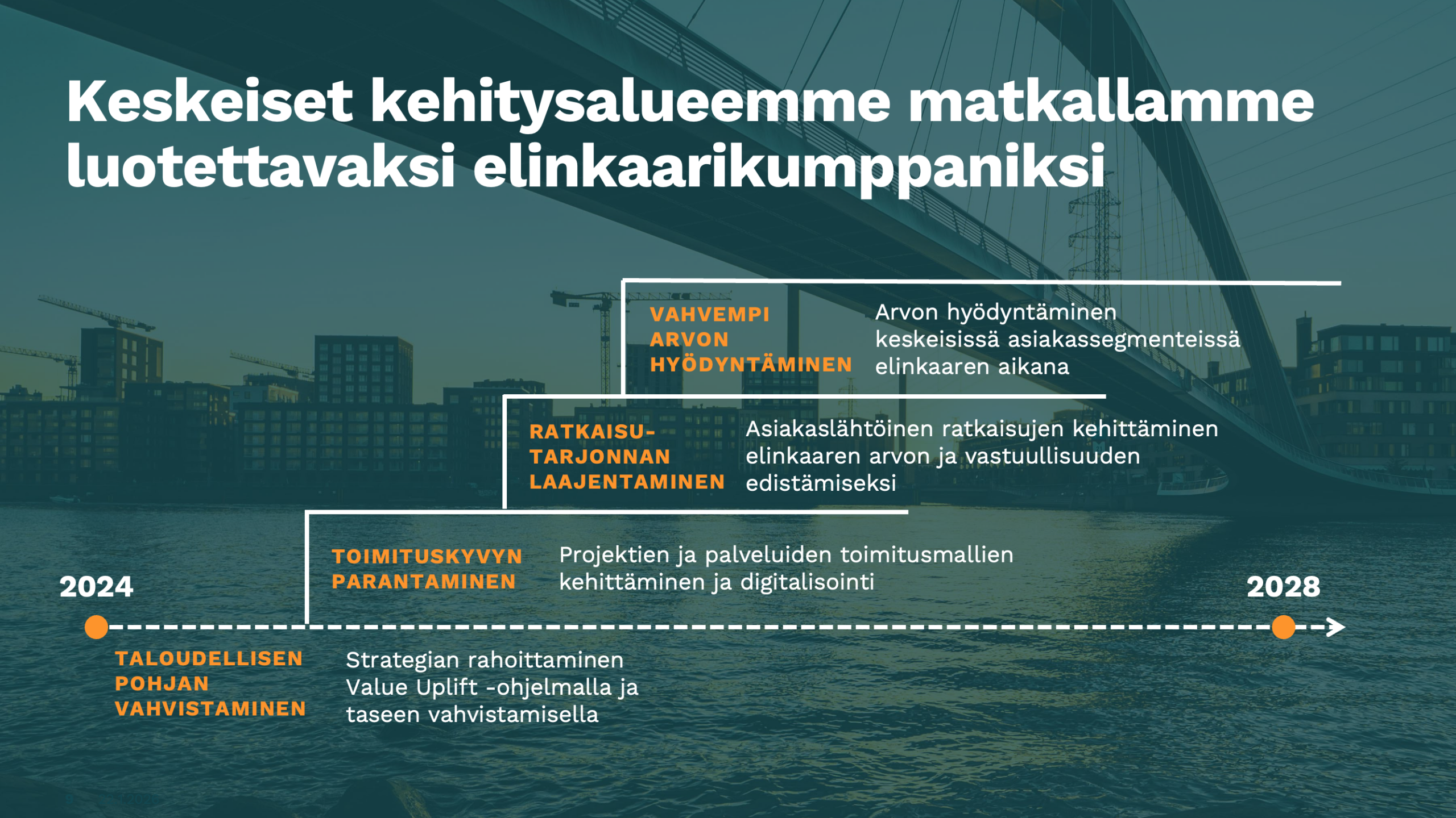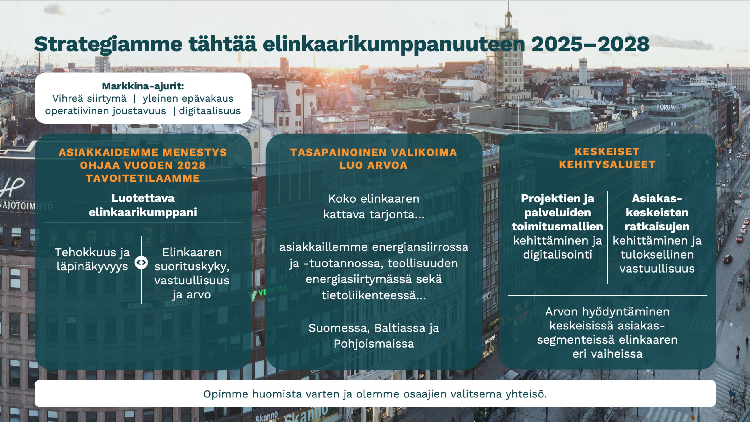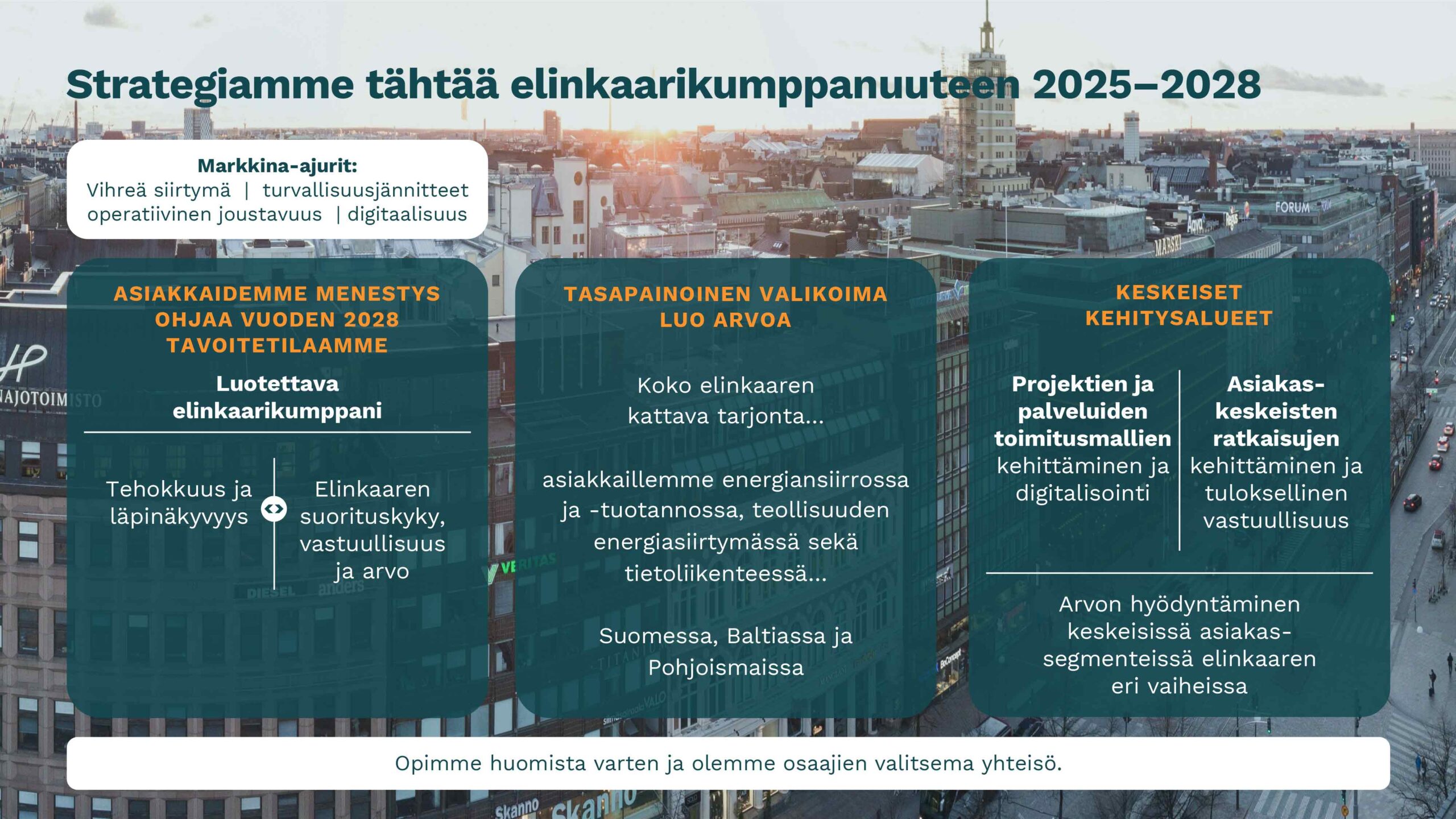 Strategia Enersensen strategisena tavoitteena on olla luotettava elinkaarikumppani asiakkailleen, jotka toimivat energiansiirrossa ja -tuotannossa, teollisuuden energiasiirtymässä sekä tietoliikenteessä. Yhtiö tavoittelee kannattavaa kasvua markkinoillaan Suomessa, Baltiassa sekä valikoidusti muualla Pohjoismaissa. Enersensen liiketoiminnan perustan muodostavat tehokkaasti ja läpinäkyvästi toteutetut projektit ja palvelut, joiden lisäksi Enersense optimoi asiakkaidensa verkkojen, järjestelmien ja tuotantolaitosten elinkaaren suorituskykyä. Enersensen elinkaaritarjonta kattaa suunnittelun, rakentamisen, käytön ja kunnossapidon sekä päivitykset ja modernisoinnit. Enersense on määritellyt keskeiset kehitysalueensa matkallaan elinkaarikumppaniksi. Yhtiö kehittää ja digitalisoi projektien ja palvelujen toimitusmalleja, luo asiakaskeskeisiä ratkaisuja monitahoisiin haasteisiin sekä edistää tarjontansa vastuullisuuskädenjälkeä. Enersense panostaa arvonluontiin keskeisissä asiakassegmenteissä maksimoidakseen elinkaarimallin potentiaalin. Enersensen strategiset tavoitteet kaudelle 2025–2028: Kasvu: keskimääräinen vuotuinen kasvu (CAGR) 4–5 % (2025: -10 %) Kannattavuus: liiketulos (EBIT) yli 5 % (2025: 5,3 %) Tase: nettovelkaantumisaste alle 100 % (2025: 6,5 %) Turvallisuus: kohti nollaa tapaturmaa, jatkuvasti laskeva poissaoloon johtaneiden tapaturmien taajuus (2025: 5,5 %) Ilmasto: tieteeseen perustuvat päästövähennystavoitteet SBTi-sitoumuksen mukaisesti 2023-2025: Oman toiminnan päästöt (scope 1–2) -63 % Arvoketjun päästöt (scope 3) -38 %