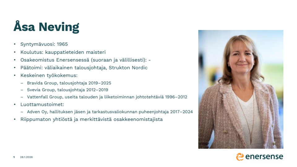 Enersensen osakkeenomistajien nimitystoimikunnan ehdotukset varsinaiselle yhtiökokoukselle 2026 Enersense International Oyj | Pörssitiedote | 28.01.2026 klo 14:00:00 EET Enersensen osakkeenomistajien nimitystoimikunta esittää 1.4.2026 pidettäväksi suunnitellulle varsinaiselle yhtiökokoukselle seuraavat ehdotukset: Hallituksen kokoonpano Osakkeenomistajien nimitystoimikunta ehdottaa, että hallitus koostuu viidestä (5) jäsenestä. Osakkeenomistajien nimitystoimikunta ehdottaa, että toimikaudeksi, joka päättyy vuoden 2027 varsinaisen yhtiökokouksen päättyessä, hallituksen jäseniksi valitaan uudelleen nykyisistä hallituksen jäsenistä Anders Dahlblom, Jan-Elof Cavander, Anna Miettinen ja Jari Ålgars. Lisäksi nimitystoimikunta ehdottaa, että Åsa Neving valitaan hallituksen uudeksi jäseneksi samalle toimikaudelle. Nykyinen hallituksen jäsen Sari Helander on ilmoittanut, ettei ole enää käytettävissä hallituksen jäsenen tehtävään. Åsa Neving (kauppatieteiden maisteri) on työskennellyt eri teollisuuden aloilla, ja tällä hetkellä hän on Strukton Nordicin väliaikainen talousjohtaja. Aikaisemmin Neving on työskennellyt Bravida Groupin talousjohtajana 2019–2025, Svevia Groupin talousjohtajana 2012–2019 sekä Vattenfall Groupissa useissa talouden ja liiketoiminnan johtotehtävissä 1996–2012. Neving on myös toiminut Adven Oy:n hallituksen jäsenenä 2017–2024. Åsa Nevingin ansioluettelo on tämän tiedotteen liitteenä. Hallitus valitsee keskuudestaan puheenjohtajan. Nimitystoimikunta suosittelee hallituksen järjestäytymiskokoukselle, että Anders Dahlblom valitaan uudelleen hallituksen puheenjohtajaksi. Osakkeenomistajien nimitystoimikunta esittää, että osakkeenomistajat ottavat yhtiökokouksessa kantaa hallituksen kokoonpanoon yhtenä kokonaisuutena. Nimitystoimikunta on ottanut Enersensen strategian ja liiketoiminnan asettamat vaatimukset sekä hallituksen monimuotoisuutta koskevat periaatteet huomioon valmistellessaan hallituksen kokoonpanoa. Kaikki ehdokkaat ovat antaneet suostumuksensa tehtävään ja nimitystoimikunnan arvion mukaan kaikki ehdolla olevat henkilöt ovat riippumattomia yhtiöstä. Anna Miettinen, Åsa Neving ja Jari Ålgars ovat lisäksi riippumattomia merkittävistä osakkeenomistajista. Anders Dahlblom ja Jan-Elof Cavander eivät ole riippumattomia yhtiön merkittävästä osakkeenomistajasta, koska he toimivat Nidoco AB:n emoyhtiön Virala Oy Ab:n operatiivisina johtajina. Hallituksen jäsenille maksettavat palkkiot Osakkeenomistajien nimitystoimikunta ehdottaa, että hallituksen jäsenille maksettavia palkkioita ei muuteta ja ne ovat tulevana toimikautena seuraavat: puheenjohtajan vuosipalkkio 42 000 euroa jäsenen vuosipalkkio 27 000 euroa Osakkeenomistajien nimitystoimikunta ehdottaa myös, että kokouspalkkiot pysyvät ennallaan ja maksetaan kustakin hallituksen ja valiokuntien kokouksesta seuraavasti: hallituksen ja valiokuntien puheenjohtajille 1 000 euroa muille jäsenille 500 euroa Matkustuskustannukset ehdotetaan korvattavaksi yhtiön kulloinkin voimassa olevan matkakulujen korvaamista koskevan politiikan mukaisesti. Osakkeenomistajien nimitystoimikunta Varsinaiselle yhtiökokoukselle 2026 ehdotukset valmistelleen osakkeenomistajien nimitystoimikunnan kokoonpano on seuraava: puheenjohtaja Alexander Ehrnrooth (Nidoco AB), Marjo Miettinen (Ensto Invest Oy) ja Janne Vertanen (Verman Holding Oy). Osakkeenomistajien nimitystoimikunnan ehdotukset sisällytetään myöhempänä ajankohtana julkaistavaan yhtiökokouskutsuun. ENERSENSE INTERNATIONAL OYJLiisi TamminenViestintä- ja vastuullisuusjohtaja Lisätietoja:Alexander EhrnroothNimitystoimikunnan puheenjohtajaPuhelin: +358 9 6122340 Mediayhteydenotot:Liisi Tamminen, viestintä- ja vastuullisuusjohtajaPuh. +358 44 222 5552liisi.tamminen@enersense.com Åsa Neving Cv FI