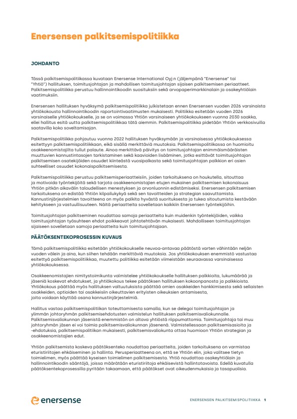 Kutsu Enersense International Oyj:n varsinaiseen yhtiökokoukseen Enersense International Oyj | Pörssitiedote | 12.02.2026 klo 08:35:00 EET Enersense International Oyj:n (”Enersense” tai ”Yhtiö”) osakkeenomistajat kutsutaan varsinaiseen yhtiökokoukseen, joka pidetään keskiviikkona 1.4.2026 klo 14.00 tapahtumatila Elielissä Sanomatalossa osoitteessa Töölönlahdenkatu 2, 00100 Helsinki. Kokoukseen ilmoittautuneiden vastaanottaminen ja äänestyslippujen jakaminen sekä kahvitarjoilu aloitetaan klo 13.30. Osakkeenomistajat voivat käyttää äänioikeuttaan yhtiökokouksessa myös äänestämällä ennakkoon. Ohjeet ennakkoäänestykseen on esitetty tämän yhtiökokouskutsun osassa C.4. ”Äänestäminen ennakkoon”. A. VARSINAISESSA YHTIÖKOKOUKSESSA KÄSITELTÄVÄT ASIAT Yhtiökokouksessa käsitellään seuraavat asiat: Kokouksen avaaminen Kokouksen järjestäytyminen Pöytäkirjantarkastajan ja ääntenlaskun valvojan valitseminen Kokouksen laillisuuden toteaminen Läsnä olevien toteaminen ja ääniluettelon vahvistaminen Vuoden 2025 tilinpäätöksen, toimintakertomuksen ja tilintarkastuskertomuksen esittäminen Toimitusjohtajan katsaus Enersensen tilinpäätös, toimintakertomus sisältäen kestävyysraportin, tilintarkastuskertomus ja kestävyysraportin varmennuskertomus ovat saatavilla Yhtiön internetsivuilla osoitteessa www.enersense.fi/sijoittajalle/hallinnointi/yhtiokokous/ viimeistään 11.3.2026. Tilinpäätöksen vahvistaminen Taseen osoittaman voiton käyttäminen ja osingonjaosta päättäminen Hallitus ehdottaa yhtiökokoukselle, että 31.12.2025 päättyneen tilikauden tulos siirretään edellisten tilikausien voitto- ja tappiotilille ja tilikaudelta vahvistettavan taseen perusteella ei jaeta osinkoa. Vastuuvapaudesta päättäminen hallituksen jäsenille ja toimitusjohtajalle tilikaudelta 1.1.2025–31.12.2025 Palkitsemisraportin käsittely Hallitus ehdottaa, että yhtiökokous hyväksyy Yhtiön toimielinten palkitsemisraportin tilikaudelta 2025. Yhtiökokouksen päätös palkitsemisraportin hyväksymisestä on neuvoa-antava. Palkitsemisraportti on saatavilla Yhtiön internetsivuilla osoitteessa www.enersense.fi/sijoittajalle/hallinnointi/yhtiokokous/ viimeistään 11.3.2026. Palkitsemispolitiikan käsittely Hallitus ehdottaa, että yhtiökokous vahvistaa päivitetyn Yhtiön toimielinten palkitsemispolitiikan. Yhtiökokouksen päätös päivitetyn palkitsemispolitiikan vahvistamisesta on neuvoa-antava. Palkitsemispolitiikka esitettiin yhtiökokoukselle viimeksi 4.4.2022 pidetyssä varsinaisessa yhtiökokouksessa. Päivitetty palkitsemispolitiikka on saatavilla Yhtiön internetsivuilla osoitteessa www.enersense.fi/sijoittajalle/hallinnointi/yhtiokokous/ ja se on julkistettu tämän kutsun liitteenä. Hallituksen jäsenten palkkioista päättäminen Osakkeenomistajien nimitystoimikunta ehdottaa, että hallituksen jäsenille maksettavia palkkioita ei muuteta ja ne ovat tulevana toimikautena seuraavat: puheenjohtajan vuosipalkkio 42 000 euroa jäsenen vuosipalkkio 27 000 euroa Osakkeenomistajien nimitystoimikunta ehdottaa myös, että kokouspalkkiot pysyvät ennallaan ja maksetaan kustakin hallituksen ja valiokuntien kokouksesta seuraavasti: hallituksen ja valiokuntien puheenjohtajille 1 000 euroa muille jäsenille 500 euroa Matkustuskustannukset ehdotetaan korvattavaksi Yhtiön kulloinkin voimassa olevan matkakulujen korvaamista koskevan politiikan mukaisesti. Hallituksen jäsenten lukumäärästä päättäminen Osakkeenomistajien nimitystoimikunta ehdottaa, että hallitus koostuu viidestä (5) jäsenestä. Hallituksen jäsenten valitseminen Osakkeenomistajien nimitystoimikunta ehdottaa, että toimikaudeksi, joka päättyy vuoden 2027 varsinaisen yhtiökokouksen päättyessä, hallituksen jäseniksi valitaan uudelleen nykyisistä hallituksen jäsenistä Anders Dahlblom, Jan-Elof Cavander, Anna Miettinen ja Jari Ålgars. Lisäksi nimitystoimikunta ehdottaa, että Åsa Neving valitaan hallituksen uudeksi jäseneksi samalle toimikaudelle. Nykyinen hallituksen jäsen Sari Helander on ilmoittanut, ettei ole enää käytettävissä hallituksen jäsenen tehtävään. Åsa Neving (kauppatieteiden maisteri) on työskennellyt eri teollisuuden aloilla, ja tällä hetkellä hän on Strukton Nordicin väliaikainen talousjohtaja. Aikaisemmin Neving on työskennellyt Bravida Groupin talousjohtajana 2019–2025, Svevia Groupin talousjohtajana 2012–2019 sekä Vattenfall Groupissa useissa talouden ja liiketoiminnan johtotehtävissä 1996–2012. Neving on myös toiminut Adven Oy:n hallituksen jäsenenä 2017–2024. Ehdotettujen hallituksen jäsenten tiedot ovat nähtävillä Enersensen internetsivuilla osoitteessa www.enersense.fi/sijoittajalle/hallinnointi/yhtiokokous/. Hallitus valitsee keskuudestaan puheenjohtajan. Nimitystoimikunta suosittelee hallituksen järjestäytymiskokoukselle, että Anders Dahlblom valitaan uudelleen hallituksen puheenjohtajaksi. Osakkeenomistajien nimitystoimikunta esittää, että osakkeenomistajat ottavat yhtiökokouksessa kantaa hallituksen kokoonpanoon yhtenä kokonaisuutena. Nimitystoimikunta on ottanut Enersensen strategian ja liiketoiminnan asettamat vaatimukset sekä hallituksen monimuotoisuutta koskevat periaatteet huomioon valmistellessaan hallituksen kokoonpanoa. Kaikki ehdokkaat ovat antaneet suostumuksensa tehtävään ja nimitystoimikunnan arvion mukaan kaikki ehdolla olevat henkilöt ovat riippumattomia Yhtiöstä. Anna Miettinen, Åsa Neving ja Jari Ålgars ovat lisäksi riippumattomia merkittävistä osakkeenomistajista. Anders Dahlblom ja Jan-Elof Cavander eivät ole riippumattomia Yhtiön merkittävästä osakkeenomistajasta, koska he toimivat Nidoco AB:n emoyhtiön Virala Oy Ab:n operatiivisina johtajina. Tilintarkastajan palkkiosta päättäminen Hallitus ehdottaa yhtiökokoukselle hallituksen tarkastusvaliokunnan suosituksen mukaisesti, että tilintarkastajan palkkio maksetaan tarkastusvaliokunnan hyväksymän laskun p